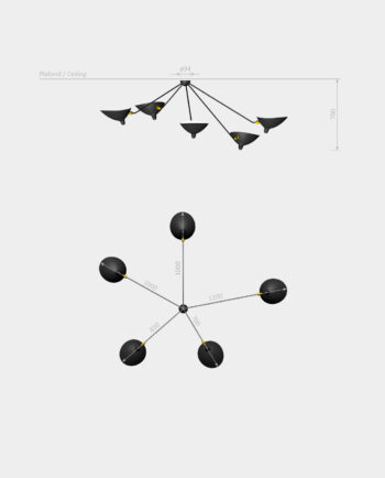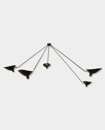 Plafonnier 6 bras pivotants (1958), en noir ou blanc, idéal pour sublimer votre intérieur avec son design unique. Ce produit existe également en noir & blanc (2 bras en noir et 4 bras au centre en blanc). L’intérieur des réflecteurs est toujours blanc brillant. Rotation possible jusqu’à 270° et inclinaison des réflecteurs jusqu’à 55°.